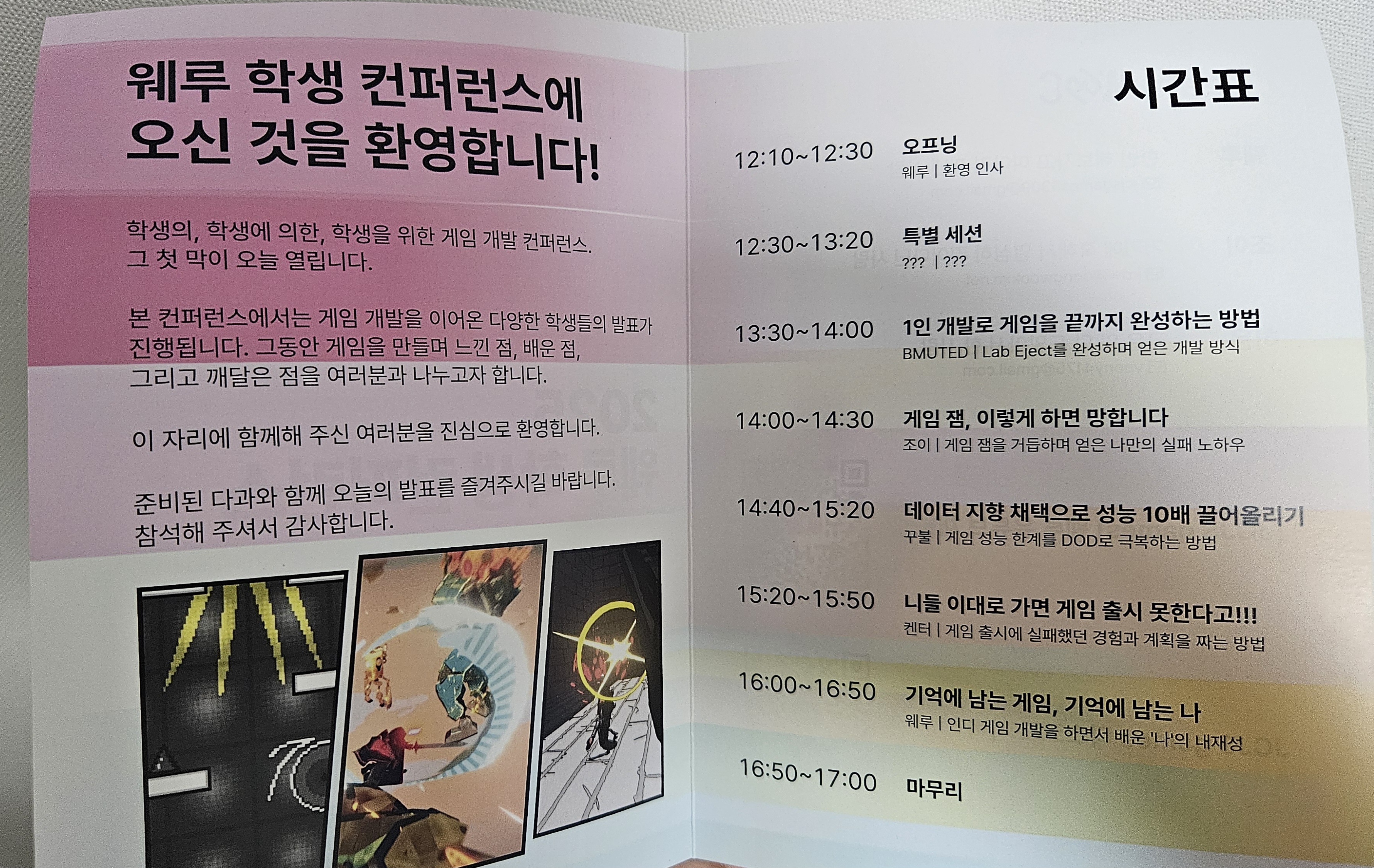 어제는 이 영상을 통해 알게 된 학생 게임 개발자 웨루 님이 주최하는 컨퍼런스에 다녀왔다.