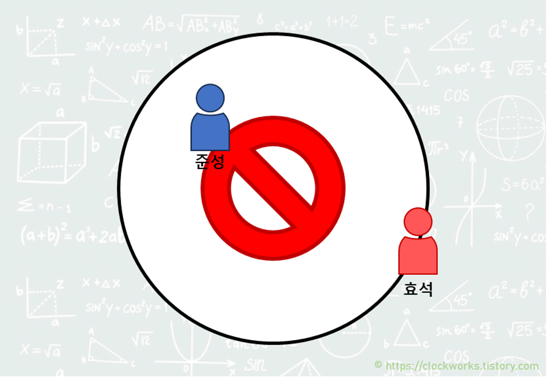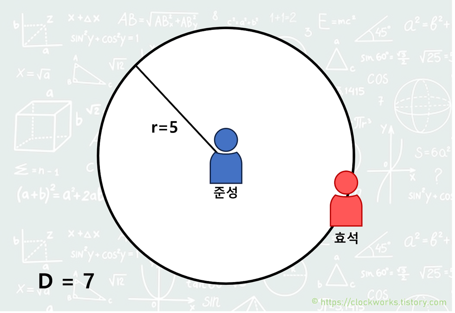 위 이미지에서 게임판은 반지름이 5인 원이고, D는 7이다. 만약 준성이가 말을 가운데에 둔다면, 효석이는 어디에 말을 두어도 두 말 사이의 거리는 D 미만이 된다.